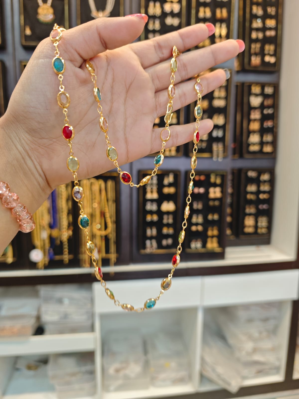 Enhance your everytime look with this beautiful gold-plated multicolor stone chain necklace designed especially for women who love elegance and simplicity. This 21-inch long chain is crafted with 36 premium stones in five vibrant shades — red, green, blue, pink, and white — making it a perfect match for ethnic wear, casual outfits, and festive occasions.