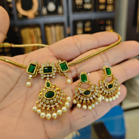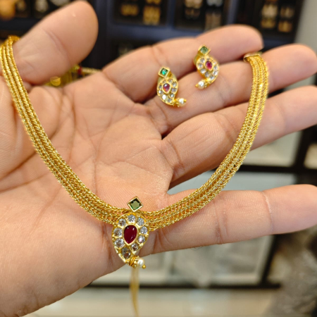 Elevate your ethnic ensemble with this exquisite jewellery set, a perfect blend of traditional craftsmanship and contemporary flair. The necklace features a stunning center piece adorned with vibrant gemstones and lustrous pearls, complemented by a twisted golden chain that exudes elegance. The matching earrings, with their floral motifs and dangling pearls, add a touch of grace to your overall look. Meticulously handcrafted by skilled artisans, this jewellery set is a testament to India’s rich cultural heritage. Whether you’re attending a festive occasion or a formal event, this versatile set will undoubtedly make you the cynosure of all eyes. Embrace the timeless beauty of Indian jewellery and elevate your style quotient with this captivating ensemble.
